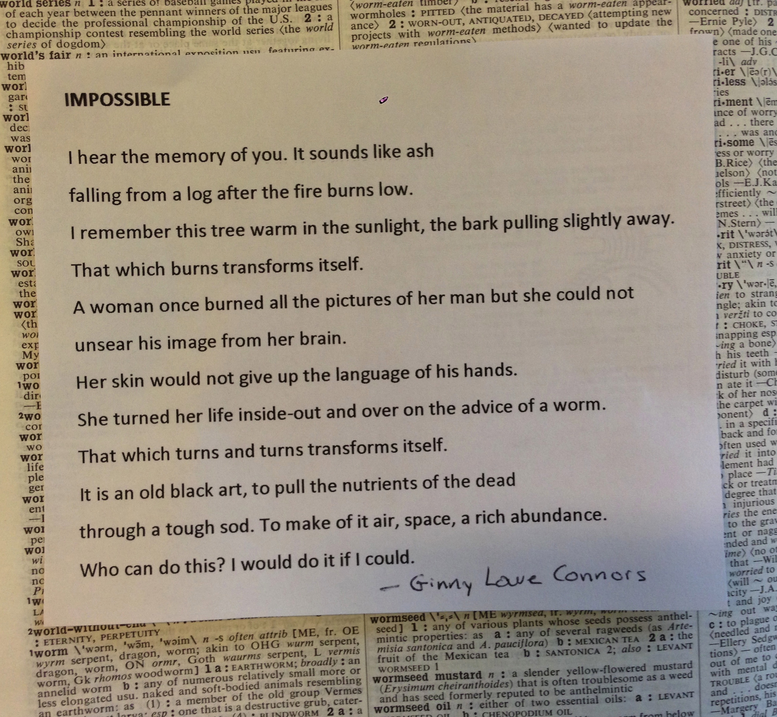 Ginny Love Connors’ poem “Impossible” is above the word “worm.” A worm, like the poet, like the “old black art,” can transform dirt/pain into something richer, something that allows growth.