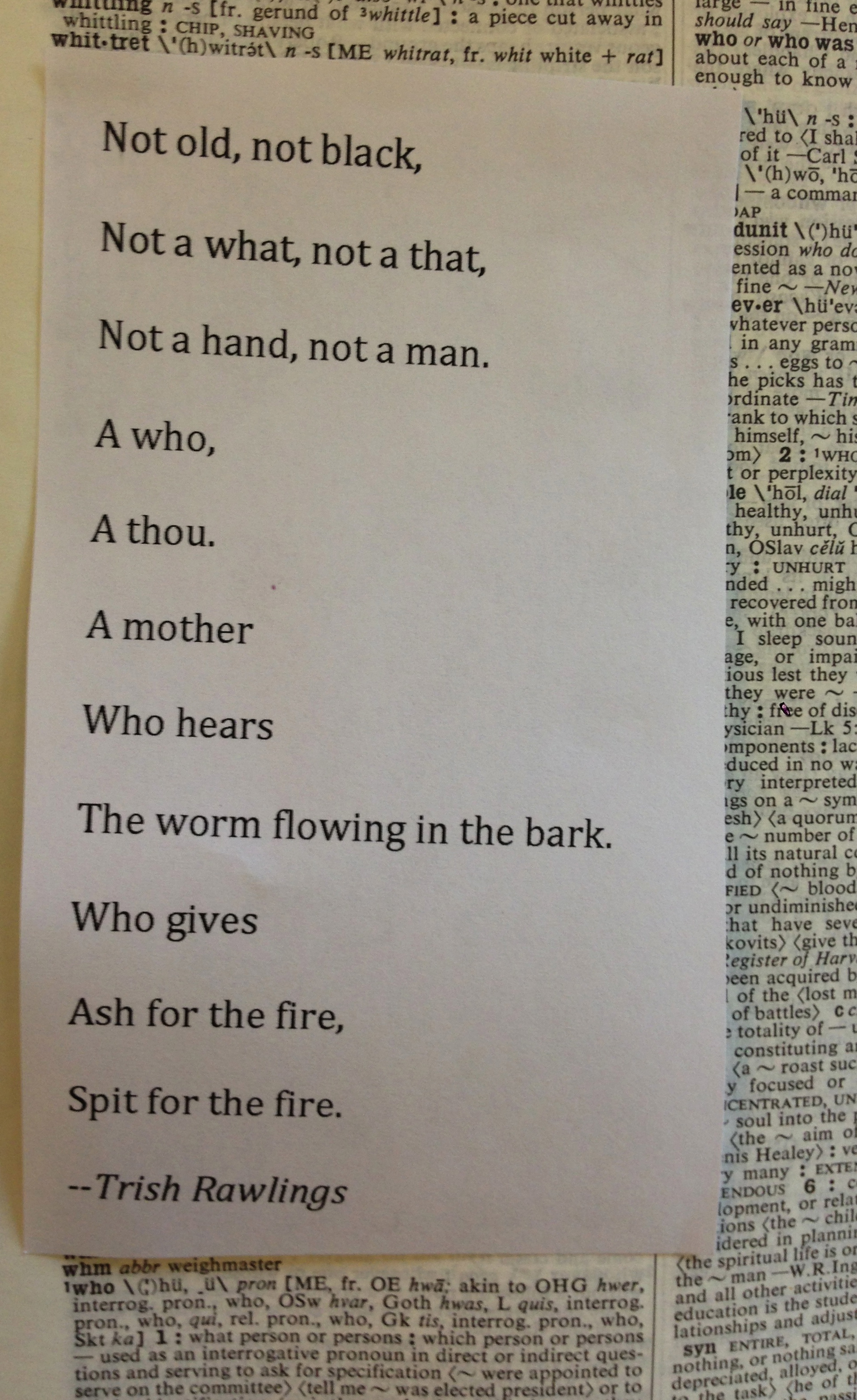 Trish Rawlings’ untitled poem, which I put above “who,” is composed almost entirely of words from the list. Quite a feat! It puts me in mind of a spell or incantation. Trish, please explain the sound of the worm flowing in the bark. It gives me the heebie-jeebies.