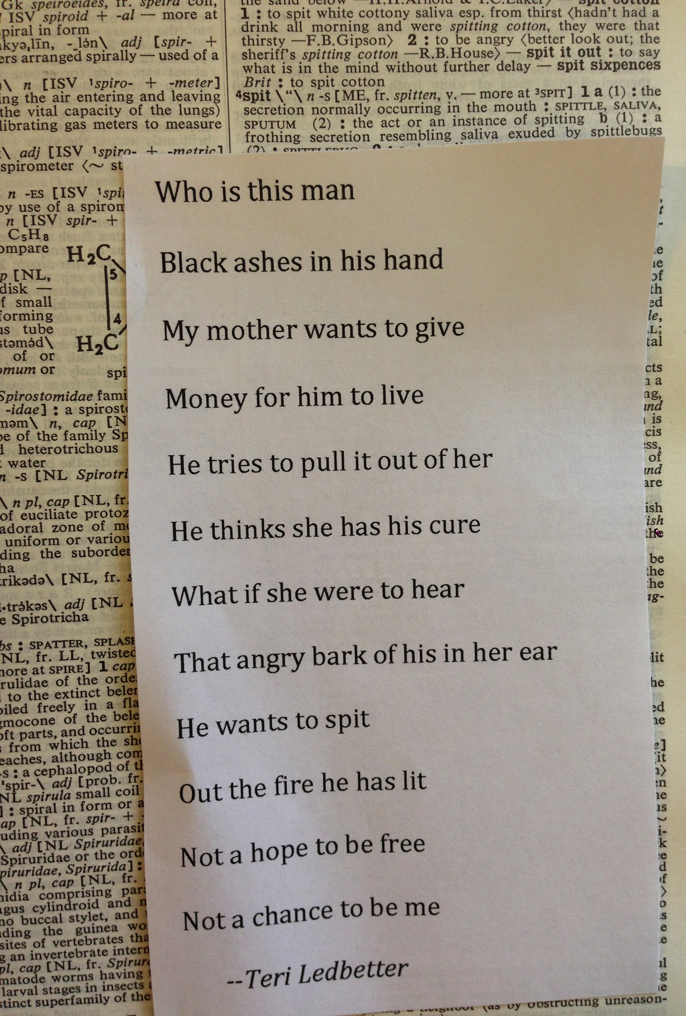 Finally, Teri Ledbetter’s poem. The situation is evocative and mysterious–is the man begging on the street corner or is he someone in her inner circle? At any rate, he’s an interloper, not welcome in the child’s world.