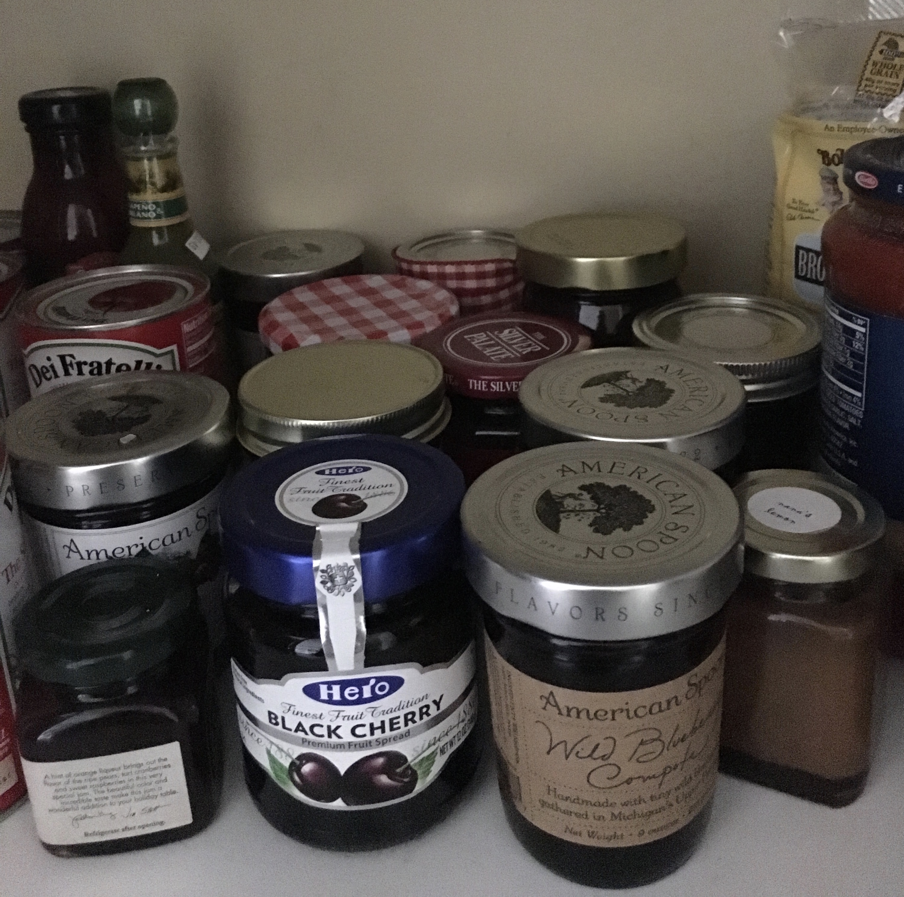 This is a picture of the jam jars in my pantry. I count thirteen and that doesn’t include the outpost colony of orange marmalade and apricot preserves that live in the back of my refrigerator.
